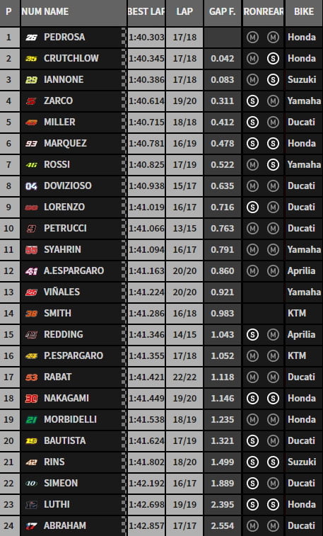 Avant le rush final, la hiérarchie se présente donc comme suit : Andrea Iannone, Cal Crutchlow, Marc Márquez, Valentino Rossi, Jack Miller, Maverick Vinales, Andrea Dovizioso, Hafizh Syahrin, Takaaki Nakagami et Jorge Lorenzo. Dani Pedrosa est 11e, Danilo Petrucci 12e, Johann Zarco 14e.