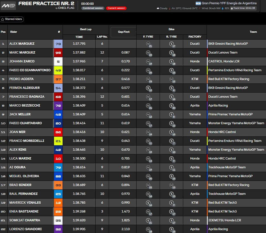 Résultats de la Free Practice 2 du Grand Prix d’Argentine MotoGP 2025 :
