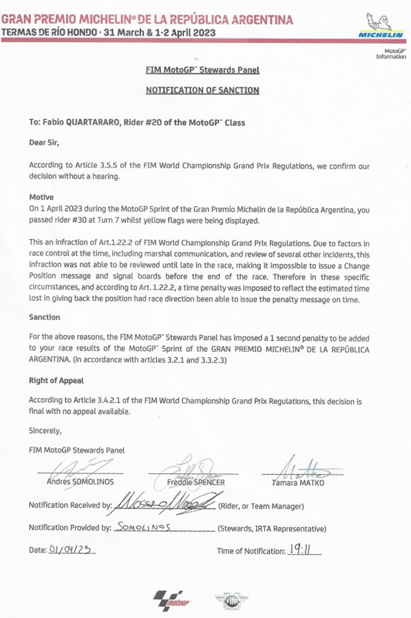Sinon, pour bien confirmer que rien ne sera épargné à Fabio Quartararo dans ce Grand Prix d’Argentine, une pénalité d’une seconde lui a été infligée par le collège des commissaires peu après l’arrivée du Sprint pour avoir dépassé Nakagami dans la course sous le régime du drapeau jaune. Si son écart sur le superbe vainqueur Brad Binder passe de 3.856 secondes à 4.856 secondes, sa position de neuvième avec le point qui va avec est sauvegardée. Ce qui lui permet de tenir encore en respect Franco Morbidelli au classement général…