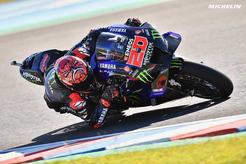 Fabio Quartararo : « Pour être honnête, mon départ n’a pas été le meilleur. Avant la ligne droite j’étais septième, donc je n’étais pas si mal. Mais ensuite, je me suis fait doubler dans la ligne droite et, globalement, les trois premiers tours ont été un cauchemar que je n’avais pas d’adhérence. Vous savez, le virage 6 est très facile car vous le passez en mettant autant de gaz que possible tout en essayant de ne pas faire trop chauffer le pneu, mais globalement ils s’échappaient à chaque fois dès le premier tour. C’est purement une question d’adhérence et les trois premiers tours ont été un désastre. J’ai perdu des positions mais après trois ou quatre tours, l’adhérence était un peu meilleure. Mais ensuite, pour doubler, j’ai directement senti que l’adhérence n’était pas la même et c’est frustrant quand vous vous êtes senti bien durant toutes les séances. Puis arrive la course et c’est complètement différent, et c’est pourquoi c’est vraiment frustrant. Mais, à la fin, quand les motos ont redéposé de la gomme Michelin sur la piste, j’ai pu aller plus vite, mais c’était trop tard et j’étais trop loin. »