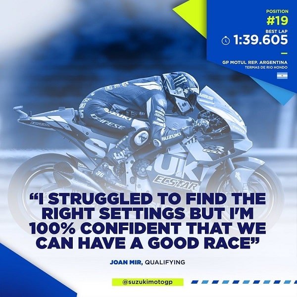 Joan Mir avait réussi à se mettre en valeur dès le premier Grand Prix de l’année en terminant huitième au Qatar, mais surtout premier du carré d’as des rookies 2019 en devançant Fabio Quartararo, Miguel Oliveira et Francesco Bagnaia. Sa précocité en MotoGP suscitait l’admiration tant des aficionados que de ses adversaires et l’on attendait de lui en Argentine monts et merveilles.