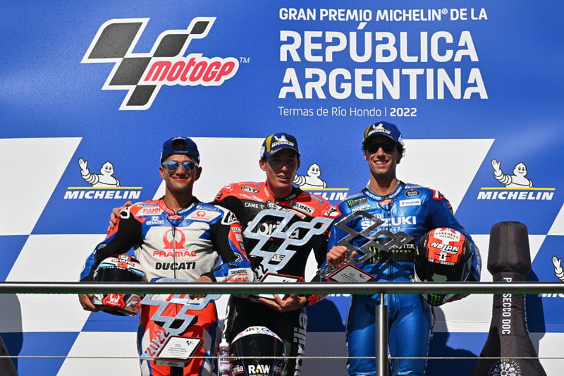 En dépit du retard lié au transport des motos et des équipements entre Mandalika et Termas de Rio Hondo, Aleix Espargaró a surmonté toutes les difficultés pour s’emparer de sa victoire première victoire en MotoGP au bout d’une longue bataille avec Jorge Martin (Pramac Racing), qui termine deuxième du Gran Premio Michelin de la República Argentina. Álex Rins (Team Suzuki Ecstar) complète le podium.
