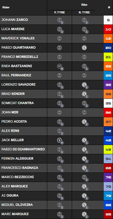 Au niveau pneumatique, tout le monde utilise le médium à l’avant sauf Jack Miller qui a opté pour le tendre, alors que les avis sont plus partagés pour l’arrière…
