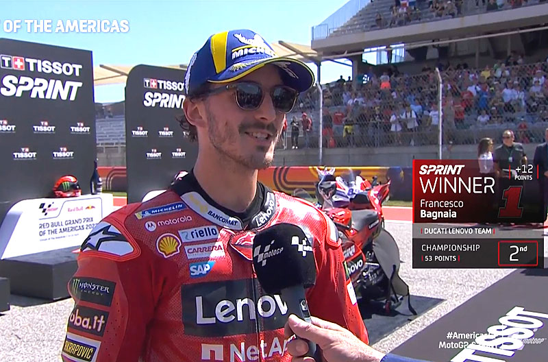 Francesco Bagnaia : « (rires) Sincèrement, je préfère cette course sprint que celle en Argentine où j’étais plus en difficulté. Je suis bien parti et j’ai juste essayé d’attaquer pour faire mon rythme. Cela a été suffisant pour créer un écart. Sincèrement, aujourd’hui les conditions étaient assez délicates à cause des températures élevées : Au freinage, c’était vraiment très glissant ! Mais je suis très heureux et nous devons maintenant nous concentrer sur demain car ce sera beaucoup plus difficile. Mais quoi qu’il en soit, je suis très heureux ! »