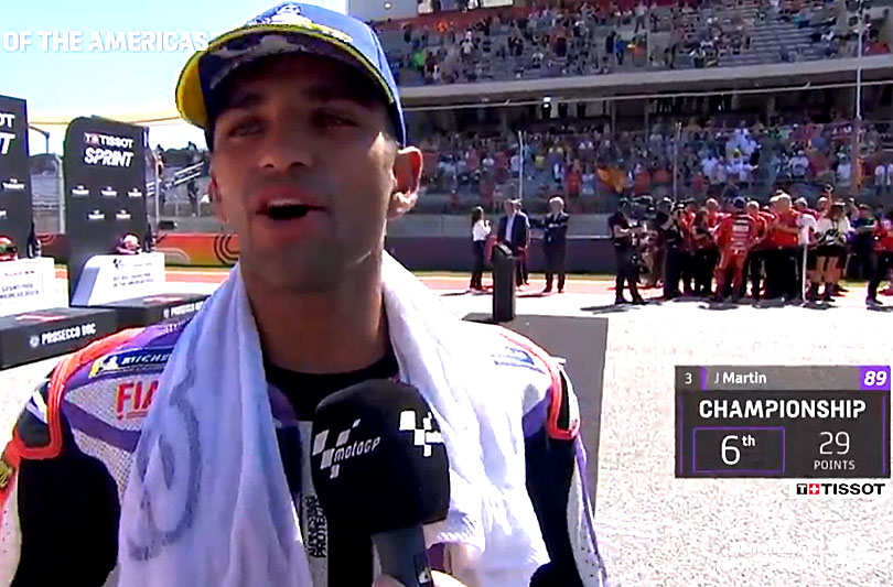 A peine descendu de sa Ducati GP23 satellite après avoir obtenu la 3è place du Sprint du Grand Prix MotoGP des Amériques sur le circuit d’Austin au Texas, Jorge Martín s’est confié devant les caméras du site officiel MotoGP.com avec la satisfaction d’avoir été plus fort que sa maladie…