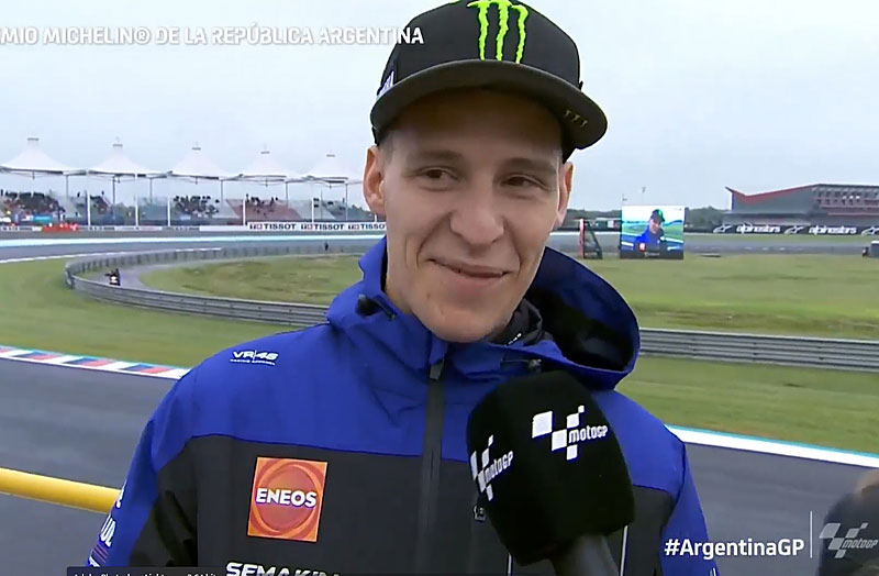 Fabio Quartararo : « C’est bien de les voir (les autres pilotes). Espérons qu’en course je pourrai me battre avec eux. Les conditions sont une peu délicates, mais nous verrons bien si ce sera plus sec pendant la course. Le warm up n’a pas été mauvais mais j’ai encore été loin des premiers. Je dois progresser. C’est une dure période pour nous en ce moment mais j’essaie de rester calme et d’avancer pas à pas. Il faut rester positif et je remercie tous les fans sont venus ici pour nous voir. »