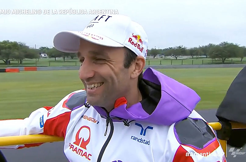 Johann Zarco, après avoir reconnu qu’un step avait été fait pour le moyen de transport : « L’adhérence était très impressionnante sur le mouillé. J’ai eu besoin d’un peu de temps pour le comprendre donc je n’ai pas pu être dans le haut du classement, mais le feeling était très intéressant, avec une grande marge de progression. Si la course est mouillée, ce sera quand même une longue course et le pneu se dégradera un peu. Peut-être que la piste séchera un peu, donc nous devrons voir. Si nous devons changer de motos, ce sera un peu plus délicat, car avec les slicks et les zones d’humidité, ce sera comme un pari : vous y allez et vous voyez ! Si on peut garder les pneus pluie pendant toute la course, j’aurai peut-être un avantage et j’essaierai d’obtenir ce que je veux depuis tant d’années maintenant (rires) ! »