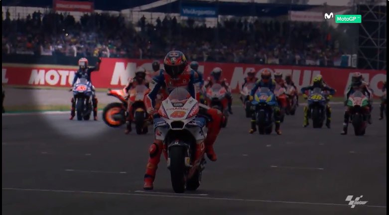 Pendant que l’on prépare la nouvelle grille de départ, on peut entendre Lin Jarvis déclarer avec raison que la pit-lane aurait équivalu à 15 secondes de pénalité (10 secondes après le dernier passage + l’accélération), un avantage pour Jack Miller que la nouvelle grille est bien incapable de préserver: « à quelle distance est Miller ? S’ils partaient de la pit-lane, ils auraient 15 secondes de retard.
