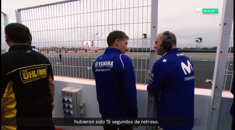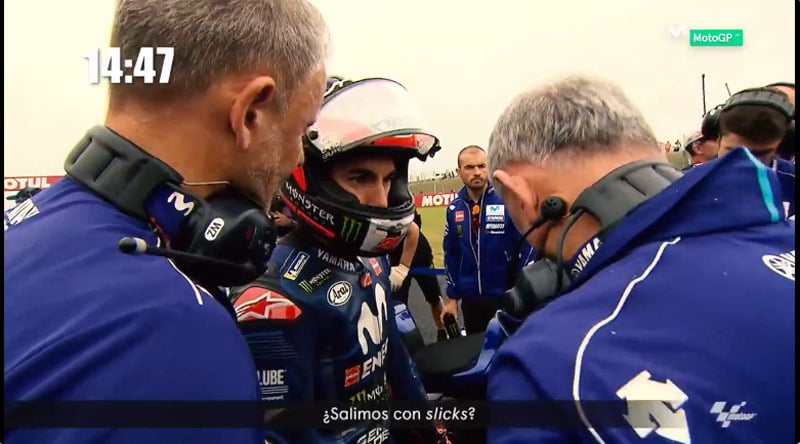 En même temps, Maverick Vinales interroge Ramon Forcada pour savoir s’il va partir en slicks, mais on lui répond que cela entraînerait un départ depuis la pit-lane: « on part avec les slicks ?