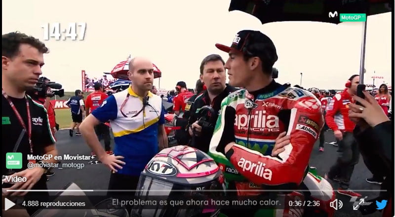 Deux minutes après, c’est au tour d’Aleix Espargaro de s’inquiéter du séchage de la piste: « le problème, c’est qu’il fait très chaud maintenant. Regarde la ligne droite, elle était complètement mouillée et elle est déjà sèche ».