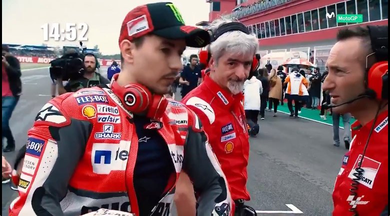 Jorge Lorenzo ne bouge pas mais Gigi Dall’Igna apparemment lui intime l’ordre de rentrer, ce qui n’a pas l’air de ravir le Majorquin…