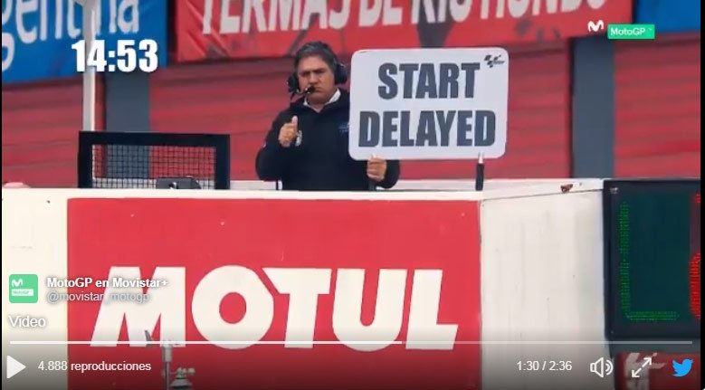 A 14h52, les premiers pilotes commencent à se placer à la sortie de la pit-lane en pneus slicks aux côtés de Franco Morbidelli, avant que, une minute plus tard, on leur signifie que le départ est reporté.