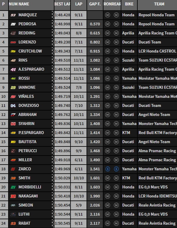 La hiérarchie est alors composée de Marc Márquez, Jorge Lorenzo, Cal Crutchlow, Andrea Dovizioso, Valentino Rossi, Alex Rins, Aleix Espargaro, Jack Miller, Johann Zarco et Dani Pedrosa.