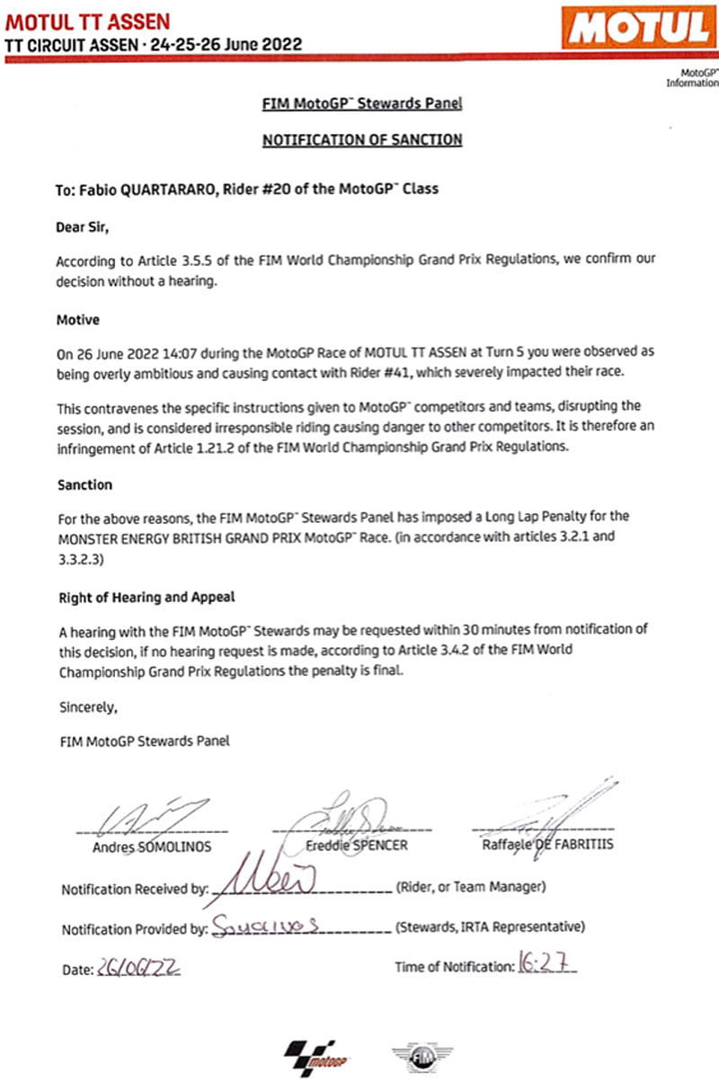 MotoGP Assen BREAKING NEWS : Fabio Quartararo sanctionné pour Silverstone !
