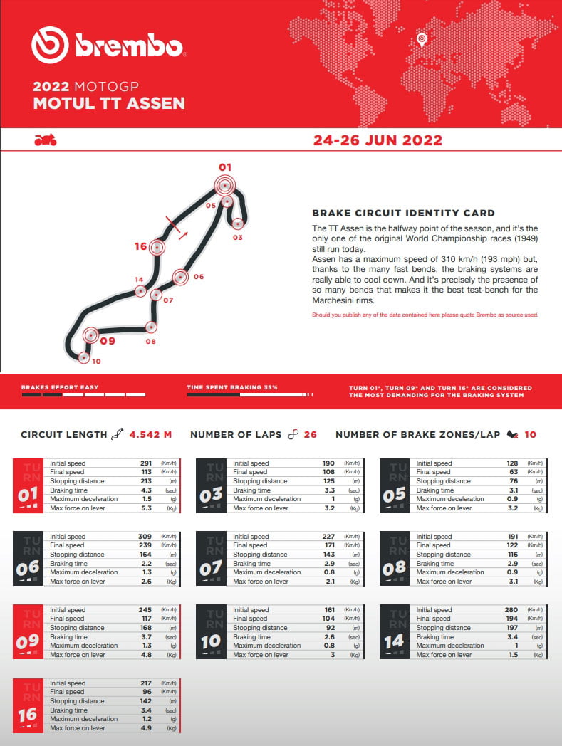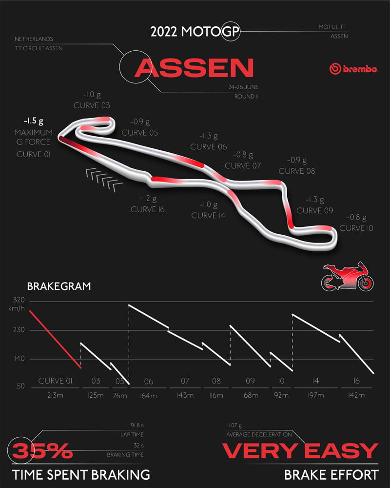 Malgré ses 18 virages, le circuit TT d’Assen est très roulant, avec plusieurs virages rapides et 10 points de freinage à chaque tour, bien que sur 7 d’entre eux, la décélération soit inférieure à 100 km/h. Les pilotes utilisent leurs freins pendant un peu moins de 32 secondes à chaque tour, ce qui est exactement la même chose que le circuit international d’Algarve (qui est d’une longueur similaire).