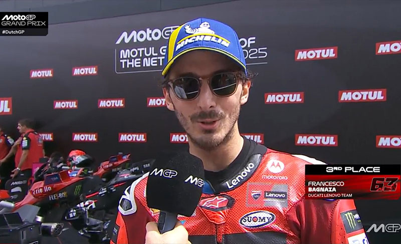 A peine descendu de sa Ducati GP25 du team d’usine Ducati Lenovo après avoir terminé 3e du Grand Prix des Pays-Bas MotoGP 2025 à Assen, Francesco Bagnaia s’est confié devant les caméras du site officiel MotoGP.com avec une semi-amertume déclarée…