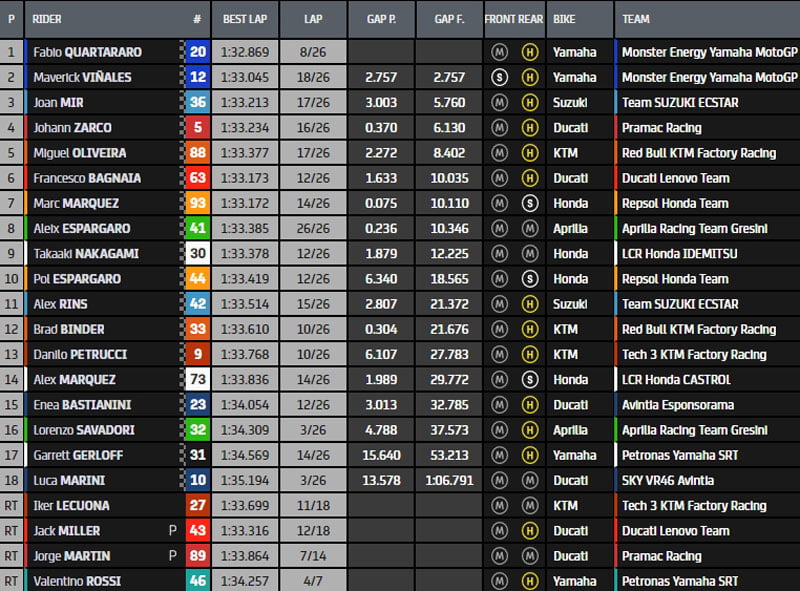 Top10 à 19 tours du but : Quartararo, Bagnaia, Nakagami, Vinales, Zarco, Mir, Oliveira, Miller, Aleix Espargaro et M.Marquez.