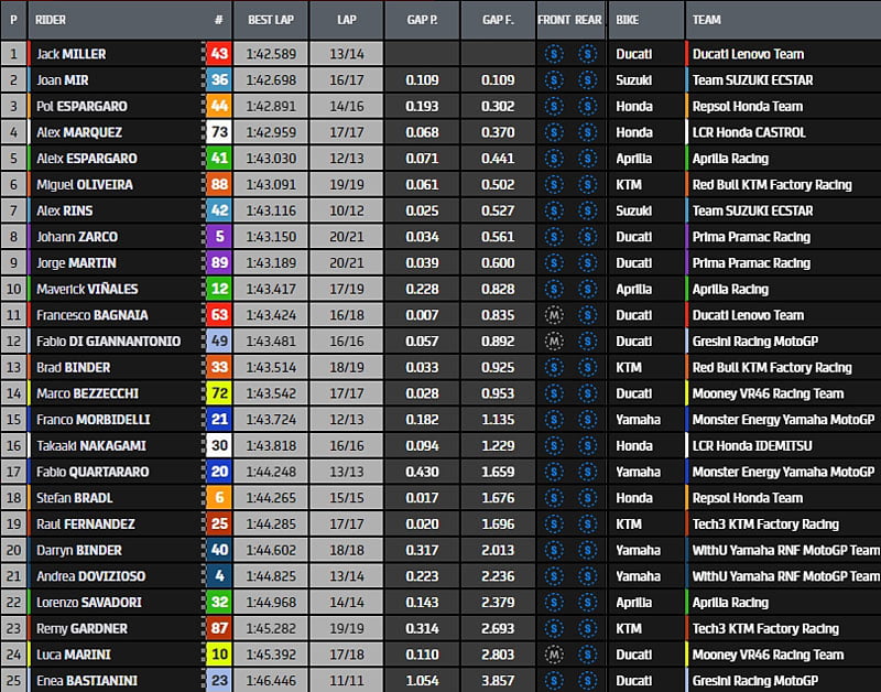 C’est le moment où la plupart des pilotes rentrent dans leur box avec une hiérarchie composée de Jack Miller, Johann Zarco, Fabio Quartararo, Franco Morbidelli, Francesco Bagnaia, Alex Márquez, Miguel Oliveira, Stefan Bradl, Lorenzo Savadori, Pol Espargaro, Jorge Martin, Enea Bastianini, Takaaki Nakagami, Aleix Espargaro, Luca Marini, Fabio Di Giannantonio, Andrea Dovizioso, Joan Mir, Marco Bezzecchi, Brad Binder, Raul Fernandez, Alex Rins, Remy Gardner, Darryn Binder et Maverick Vinales.