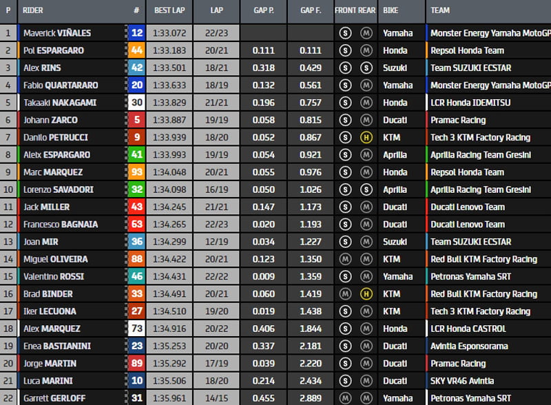 Avant le rush final, le top 10 est constitué de Maverick Vinales, Pol Espargaro, Fabio Quartararo, Danilo Petrucci, Takaaki Nakagami, Aleix Espargaro, Joan Mir, Jack Miller, Valentino Rossi et Marc Márquez.