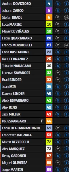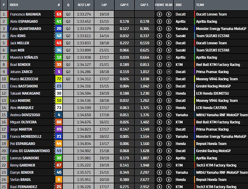 Pour le moment, Francesco Bagnaia, Aleix Espargaro, Fabio Quartararo, Alex Rins, Jack Miller, Joan Mir, Maverick Vinales, Brad Binder, Johann Zarco et Marco Bezzecchi sont donc pré-qualifiés pour la Q2.