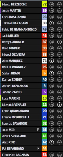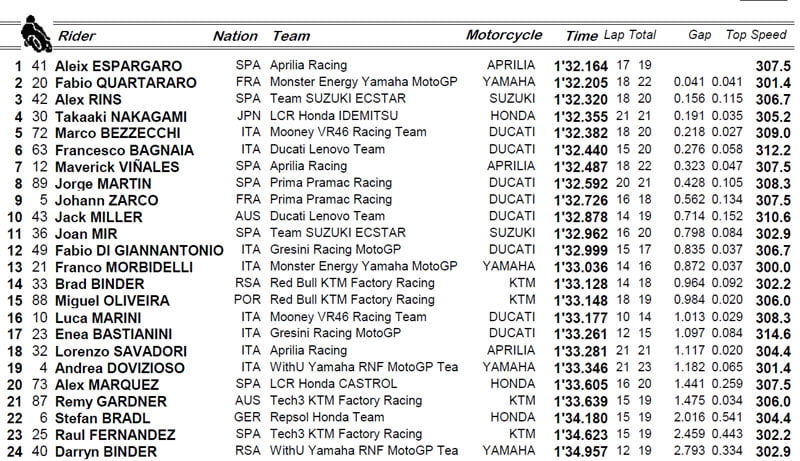 Au final, Aleix Espargaro, Fabio Quartararo, Alex Rins, Takaaki Nakagami, Marco Bezzecchi, Francesco Bagnaia, Maverick Vinales, Jorge Martin, Johann Zarco et Jack Miller obtiennent donc leur passage direct en Q2.