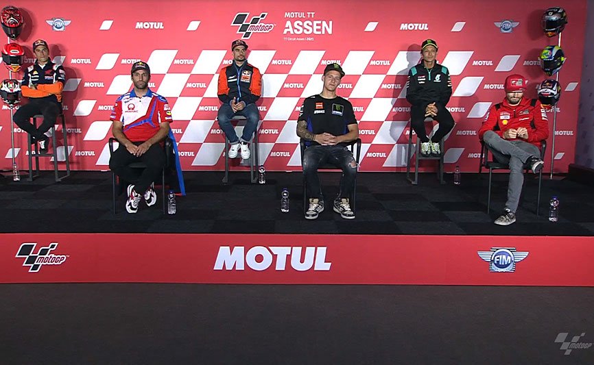 En ce jeudi 24 juin 2021, Fabio Quartararo a répondu aux questions des journalistes depuis le TT Circuit Assen, en prélude au Grand Prix des Pays-Bas, en compagnie de Johann Zarco, Jack Miller, Miguel Oliveira, Marc Márquez et Valentino Rossi.