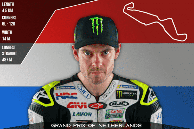 Crutchlow apprécie le circuit d’Assen, où il avait réalisé sa première pole position en MotoGP en 2013 sur une Yamaha de l’équipe Tech 3, devant les deux Honda de Marc Márquez et Stefan Bradl, suivies de la Yamaha de Valentino Rossi. Cal décrochait de nouveau la pole la même année à Brno, puis en 2016 au British Grand Prix et en 2018 à Jerez. Le Britannique a remporté trois Grands Prix en MotoGP à Brno et Phillip Island en 2016, puis en Argentine l’an dernier. Âgé de 33 ans, il va courir ce dimanche son 146e Grand Prix, toujours en catégorie MotoGP.