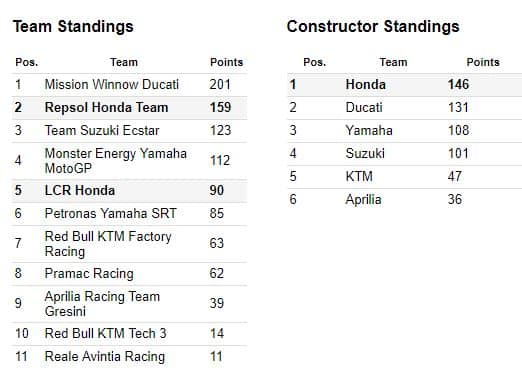 La présence d’un deuxième pilote efficace est importante pour le constructeur nippon pour le classement provisoire du Championnat du Monde des constructeurs. Comme on le voit sur le tableau ci-dessous, Ducati a une belle avance au classement des teams, et Crutchlow ne peut lui y être d’aucune utilité car faisant partie de l’équipe LCR de Lucio Cecchinello. Par contre au classement des constructeurs, Honda occupe actuellement la première position. C’est Marc Marquez qui est désigné logiquement pour rapporter le maximum de points, mais s’il ne peut terminer la course, il faudra que Cal Crutchlow fasse tout ce qu’il peut pour remplacer Jorge Lorenzo et éviter à Honda de se faire remonter au championnat par Ducati.