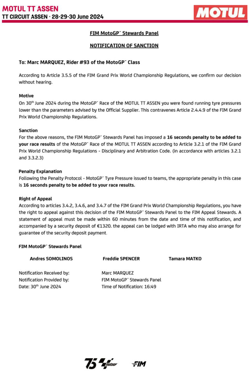 🚨 BREAKING: @marcmarquez93 drops to 10th place after receiving a penalty due to incorrect tyre pressure ⚠️#DutchGP 🇳🇱 pic.twitter.com/FLkM6l8s30