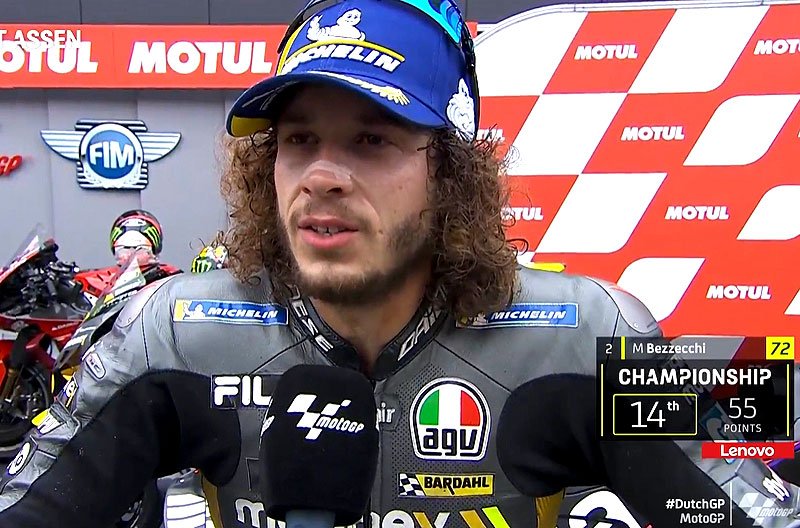 A peine descendu de sa Ducati GP22 du team satellite Mooney VR46 après avoir obtenu la 2e place du Grand Prix des Pays Bas sur le circuit du TT Assen, le rookie Marco Bezzecchi s’est confié devant les caméras du site officiel MotoGP.com, en savourant son premier podium en MotoGP.