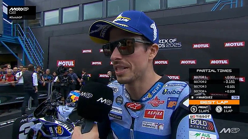A peine descendu de sa Ducati GP24 du team satellite BK8 Gresini Racing après s’être qualifié 3e pour le Grand Prix des Pays-Bas MotoGP 2025 à Assen, Alex Marquez s’est confié devant les caméras du site officiel MotoGP.com avec déjà un moral de Mister P2…