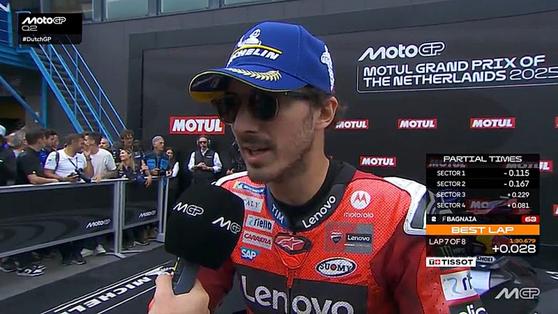 A peine descendu de sa Ducati GP25 du team d’usine Ducati Lenovo après s’être qualifié 2e pour le Grand Prix des Pays-Bas MotoGP 2025 à Assen, Francesco Bagnaia s’est confié devant les caméras du site officiel MotoGP.com avec une satisfaction certaine mais sans emballement prématuré…