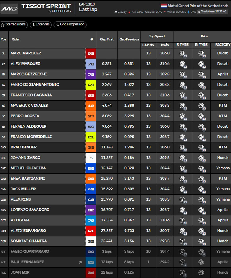 Résultats du Sprint du Grand Prix des Pays-Bas MotoGP 2025 :