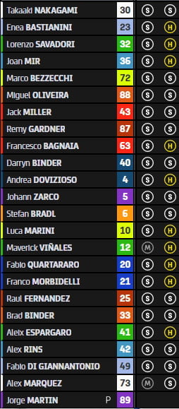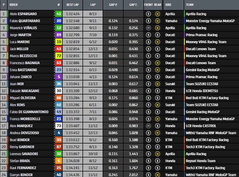 Le classement nous présente alors Aleix Espargaro, Fabio Quartararo, Luca Marini, Enea Bastianini, Johann Zarco, Joan Mir, Jack Miller, Jorge Martin, Maverick Vinales, Alex Rins, Fabio Di Giannantonio, Francesco Bagnaia, Miguel Oliveira, Franco Morbidelli, Marco Bezzecchi, Takaaki Nakagami, Lorenzo Savadori, Brad Binder, Alex Márquez, Remy Gardner, Andrea Dovizioso, Raul Fernandez, Stefan Bradl et Darryn Binder.