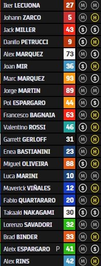 À l’exception du pneu dur avant, toutes les gommes sont de sortie, y compris des pneus pluie pour Alex Rins qui effectue sans doute un seul tour en vue d’une hypothétique course flag to flag.
