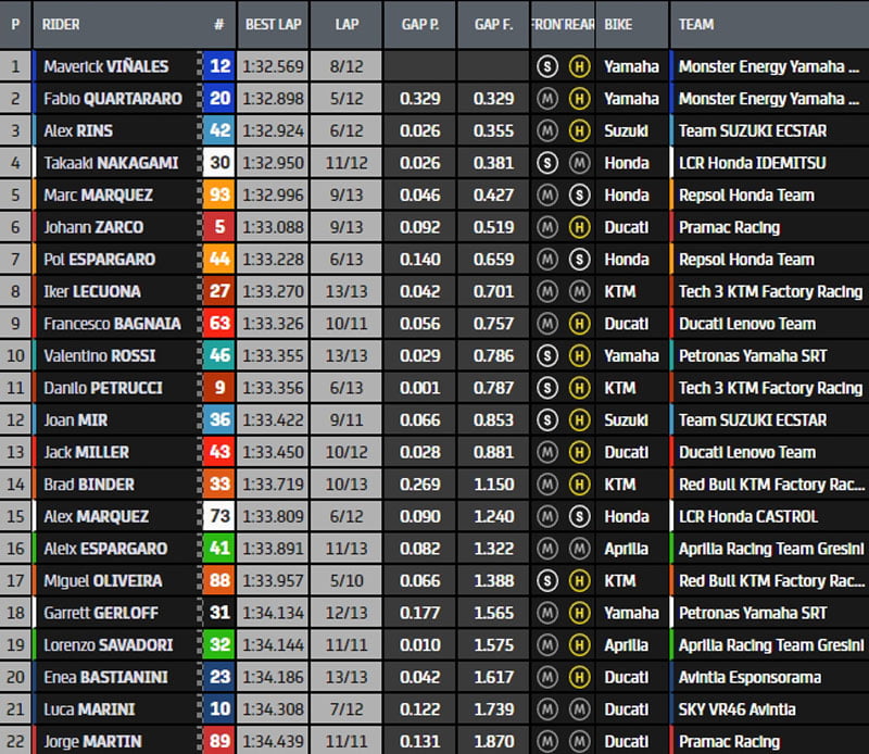 À la mi-séance, les deux Yamaha officielles précèdent Alex Rins, Pol Espargaro, Danilo Petrucci, Francesco Bagnaia, Johann Zarco, Iker Lecuona, Alex Márquez, Valentino Rossi, Marc Márquez, Jack Miller, Miguel Oliveira, Takaaki Nakagami, Joan Mir, Garrett Gerloff, Enea Bastianini, Lorenzo Savadori, Brad Binder, Luca Marini, Jorge Martin et Aleix Espargaro.