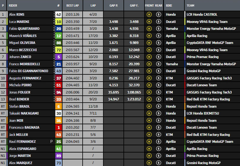 Rins prend la main devant Quartararo qui est 2.106s derrière. Marini, Bezzecchi et Vinales viennent compléter c top 5