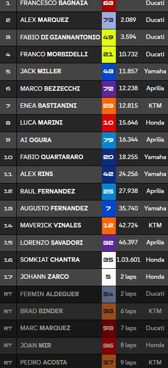 A 13 tours du but, le top 10 se compose : MMarquez (2.062s); Bagnaia, AMarquez, Dio Giannantonio, Morbidelli, Miller, Binder, Aldeguer, Acosta et Zarco.