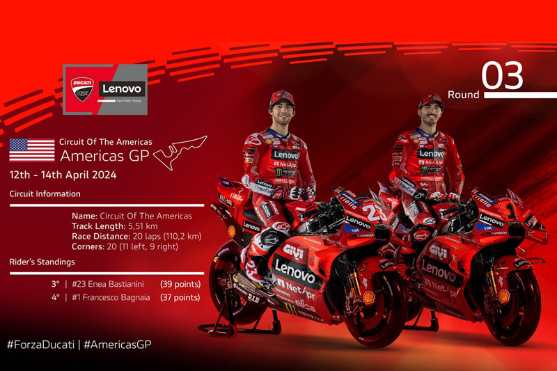 L’équipe Ducati Lenovo se présente sur le Circuit des Amériques (COTA) à Austin au Texas pour la troisième manche de la saison 2024 du MotoGP, le Grand Prix des Amériques, avec des cartes en main, mais aussi un problème…