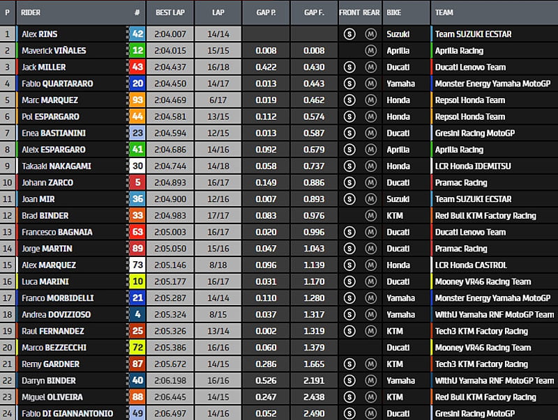 Sept minutes avant le drapeau à damier, Fabio Quartararo troisième et Alex Rins septième, améliorent le premier secteur et se retrouvent respectivement troisième et deuxième, les deux à moins de 1/10 de Maverick Vinales. Le pilote Suzuki poursuit son effort et s’empare du leadership en 2’04.168.