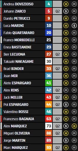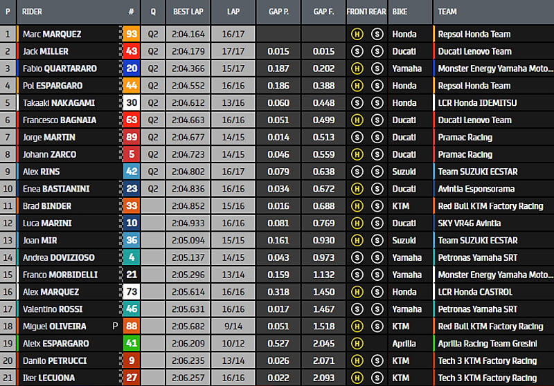 Ce matin, Marc Márquez, Jack Miller, Johann Zarco, Miguel Oliveira, Pol Espargaro, Alex Márquez, Alex Rins, Francesco Bagnaia, Brad Binder et Iker Lecuona se sont provisoirement pré- qualifiés pour la Q2 alors que les Yamaha, 15e, 17e, 20e et 21e, sont apparues en nette difficulté dans ces conditions à peine  séchantes. Les dernières prévisions anticipent finalement une course de dimanche sur le sec après un samedi très humide, mais pour le moment c’est bien une piste sèche qui accueille les pilotes MotoGP sous un ciel clairsemé, avec des températures de 30° dans l’air et 41° sur l’asphalte.