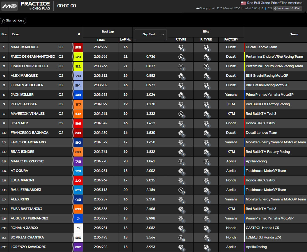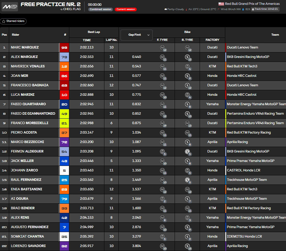 Résultats de la FP2 du Grand Prix des Amériques MotoGP 2025, à Austin :