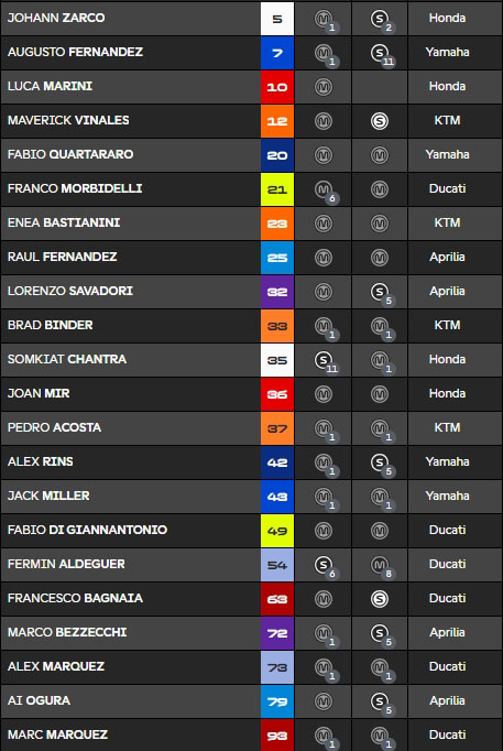 Pour les Français, y compris Johann Zarco (CASTROL Honda LCR) brillant mais chutant au plus mauvais moment, il faudra passer par la Q1 et y endiguer les velléités entre autre du toujours étonnant Ai Ogura (Trackhouse MotoGP Team), alors que Pedro Acosta (Red Bull KTM Factory Racing), le double vainqueur en titre Maverick Vinales (Red Bull KTM Tech 3) et Joan Mir () complètent la liste des pré-qualifiés pour la Qualification-2.