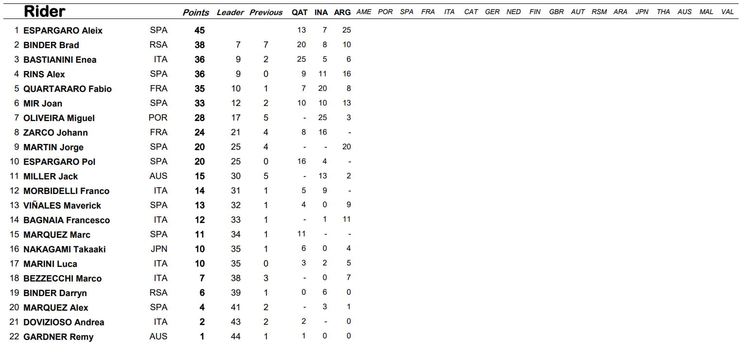 « Franchement quand je regarde les données, je me dis que je n’étais pas autant en souffrance que cela. Dans les derniers tours j’étais même en train de rattraper Martín. Nous étions un peu en difficulté mais pas plus que cela. Nous avons beaucoup attaqué pour dépasser Luca Marini et Pol Espargaró et ainsi pouvoir nous mêler à la lutte en tête de course avec Aleix et Jorge, mais cela nous a pris plusieurs tours et nous avions dû taper dans nos pneus pour en arriver là, et par conséquent je n’ai pas été en mesure de me joindre à eux. »