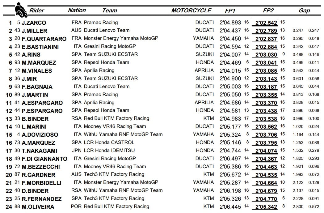 GP des Amériques – MotoGP – Classement à l’issue des FP2 :