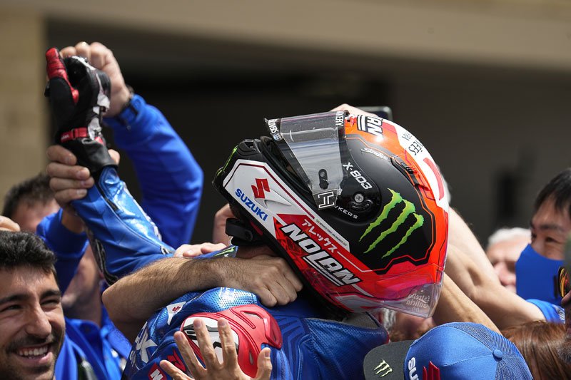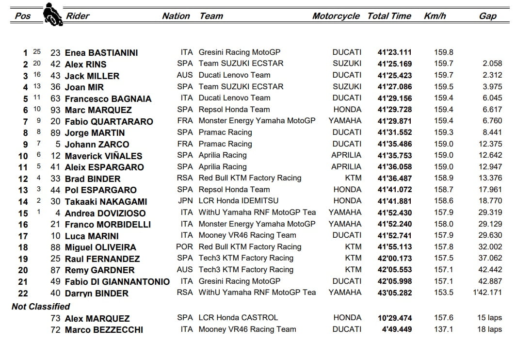 Álex Rins : « Sincèrement, je ne m’attendais pas à faire un podium, car, d’habitude, je peux remonter quelques places durant les premiers tours, mais pas aujourd’hui. J’ai donc essayé de vraiment forcer avec le pneu avant en freinant fort pour essayer de doubler quelques pilotes. Mais Enea a vraiment été malin (rires) : quand j’étais derrière lui et que j’ai essayé de le doubler, alors que je pense qu’il essayait de préserver le pneu comme tout le monde, il a commencé à attaquer très fort durant ce tour et il est devenu très difficile pour moi de continuer à rouler avec lui. J’ai essayé de maintenir mon rythme puis je suis arrivé sur Jack (Miller), et sincèrement Jack n’est pas quelqu’un de facile à doubler (Rires). Il freine vraiment fort ! Mais vous savez, j’ai tout donné dans les deux derniers virages à la fin, J’ai pu bien freiner la moto et j’ai terminé sur le podium. C’est un très bon résultat pour nous, pour Suzuki, le 500e podium, donc je me sens heureux. »