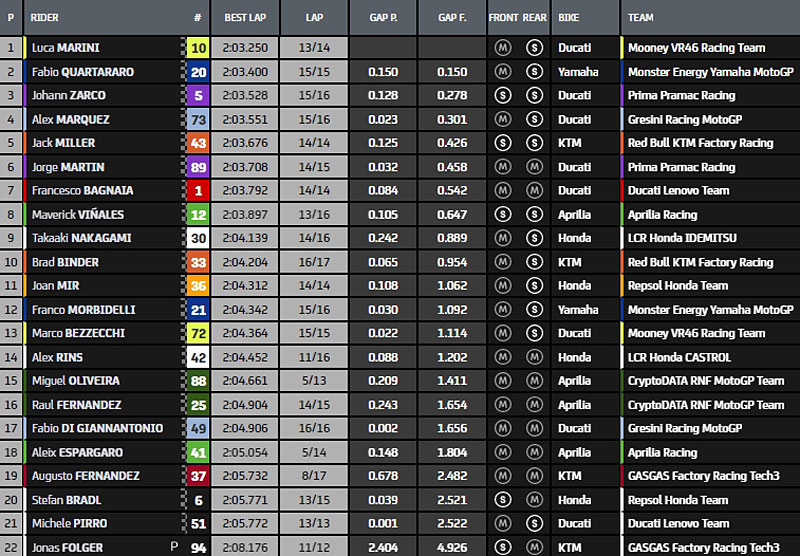 À cet instant, Fabio Quartararo précède Alex Márquez, Francesco Bagnaia, Alex Rins, Jorge Martin, Joan Mir, Franco Morbidelli, Johann Zarco, Miguel Oliveira, Marco Bezzecchi, Jack Miller, Luca Marini, Brad Binder, Aleix Espargaro, Maverick Vinales, Takaaki Nakagami, Raul Fernandez, Augusto Fernandez, Fabio Di Giannantonio, Stefan Bradl, Michele Pirro et Jonas Folger.