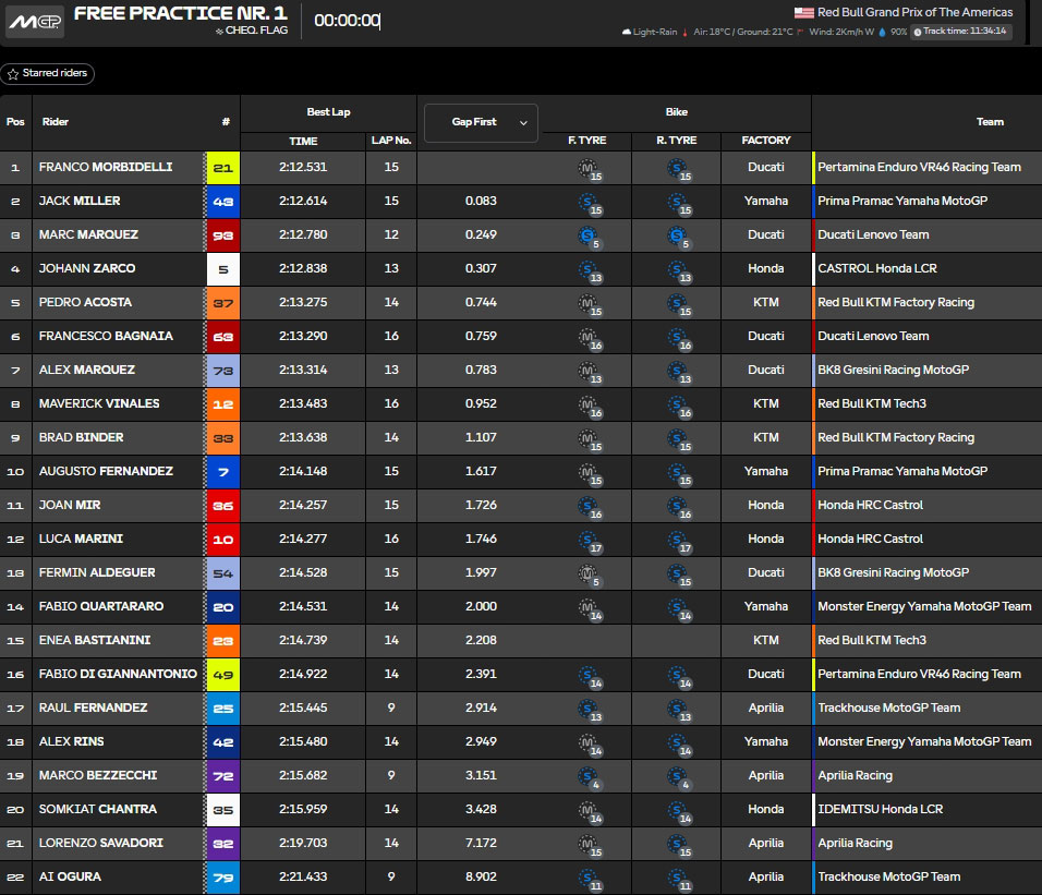 Résultats de la Practice du Grand Prix des Amériques MotoGP 2025, à Austin :