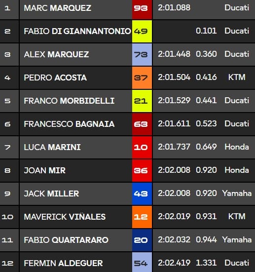 C’est MMarquez qui signe le temps de référence en 2.01.522s devant Di Giannantonio, Bagnaia, AMarquez et Mir. Vinales, Quartararo, Acosta, Morbidelli et Aldeguer complètent le top 10