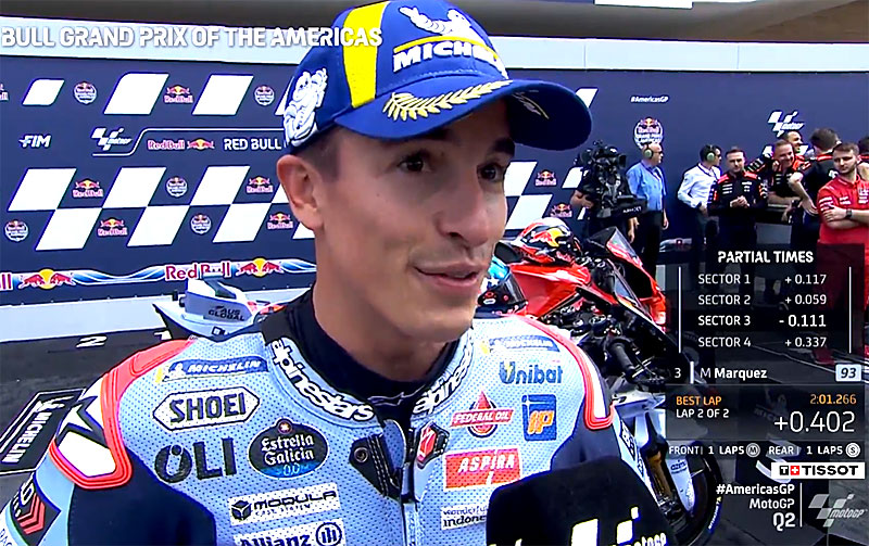 A peine descendu de sa Ducati GP23 du team Gresni après avoir obtenu la 3e place des qualifications du Grand Prix MotoGP des Amériques sur le COTA à Austin, Marc Marquez s’est confié devant les caméras du site officiel MotoGP.com avec la satisfaction de progresser jour après jour sur ce circuit qu’il affectionne…